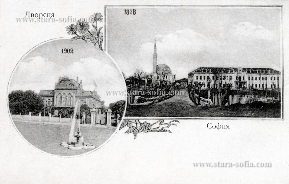 Картичка от началото на века, съпоставяща сградата на княжеския